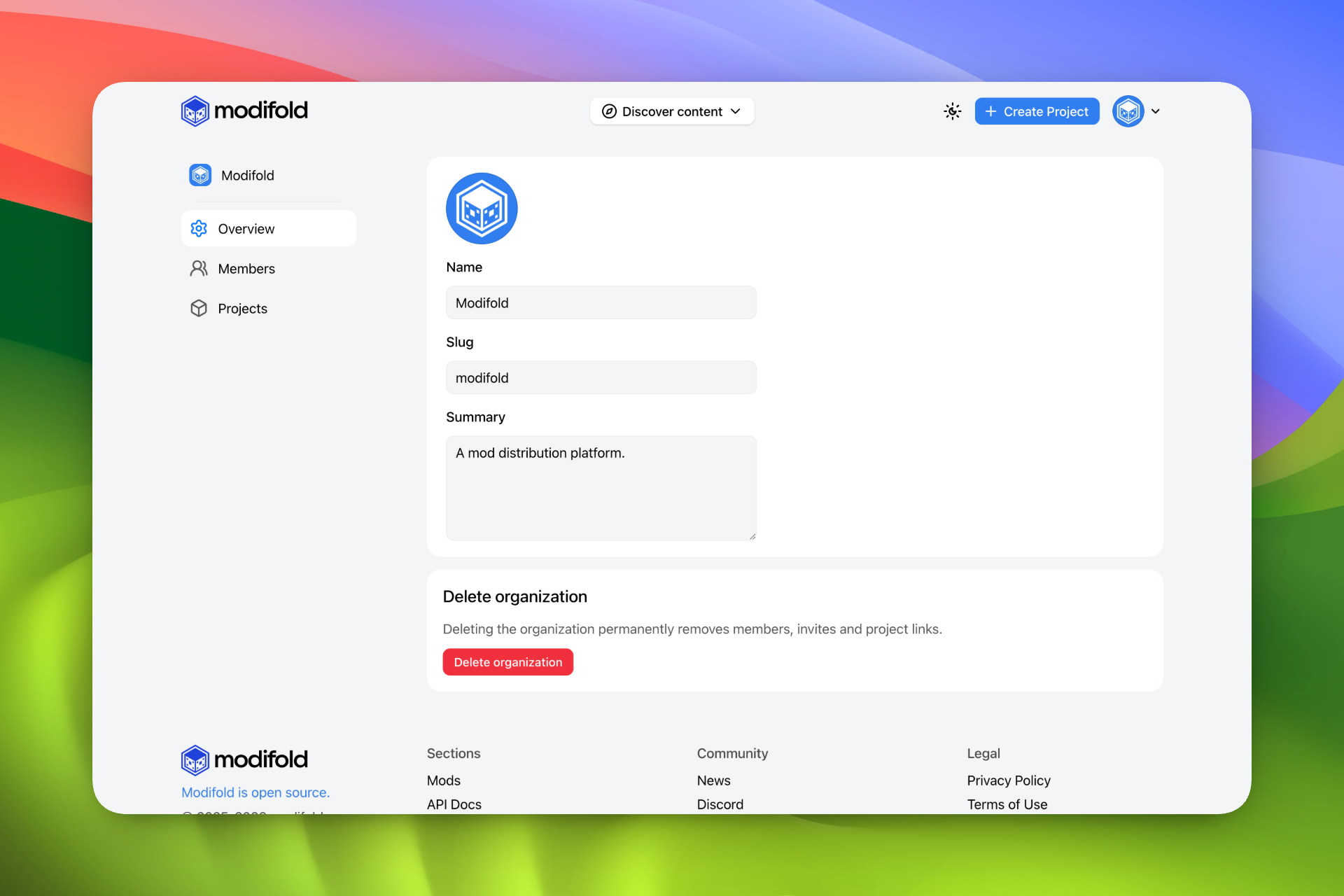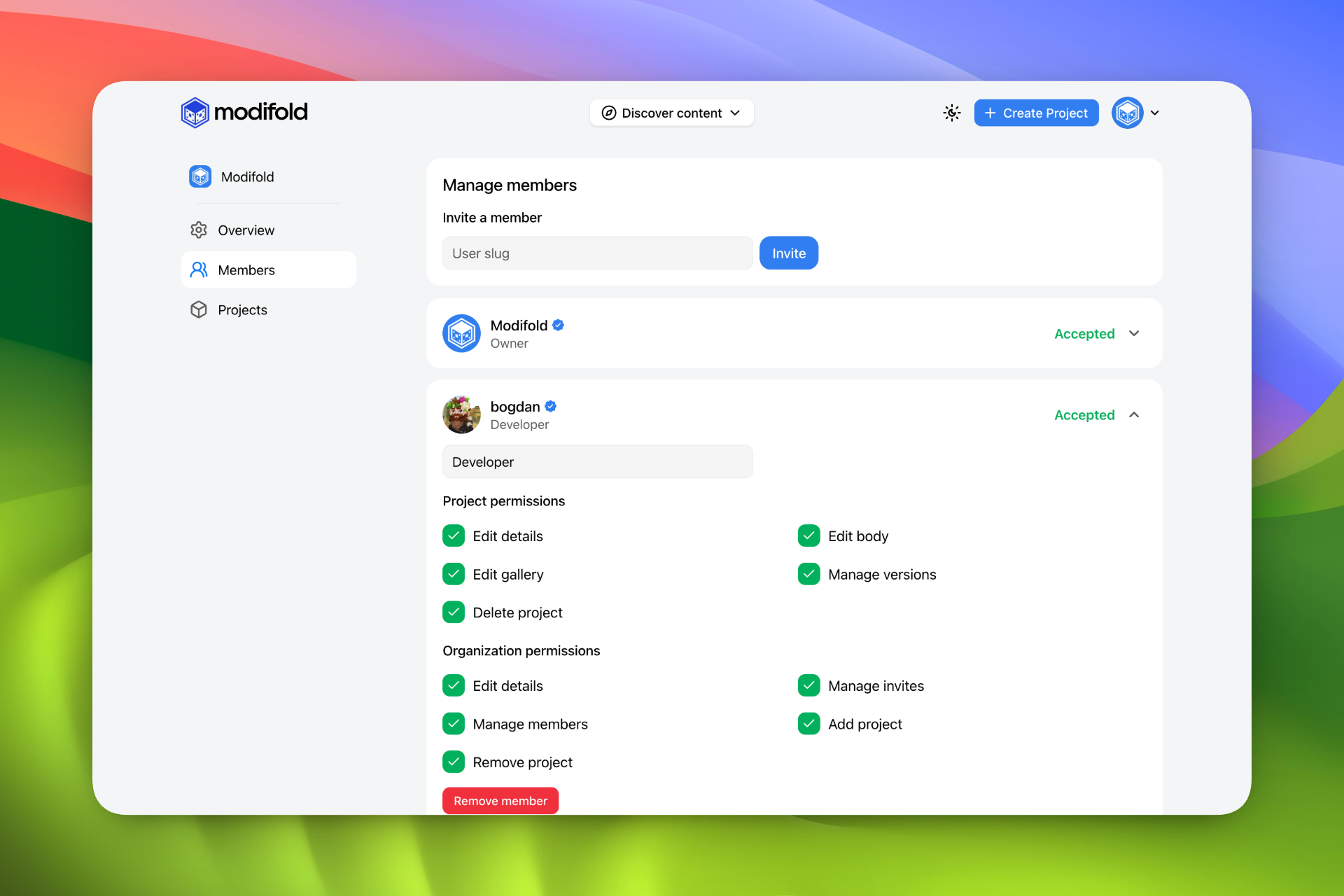 Organizations on Modifold: shared project ownership, member roles, and publishing under a team identity.